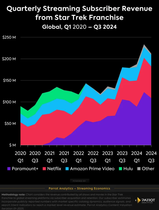 Parrot Analytics SES published reports indicating that the Star Trek franchise has been reliably making money for Paramount+, the ones the franchise belongs to nowadays, but also other streaming services such as Netlix and Amazon Prime Video. Their model estimates that from Q1 2020 until Q3 2024, shows and movies in the Star Trek franchise have generated over $2.6 billion in subscriber revenue globally.